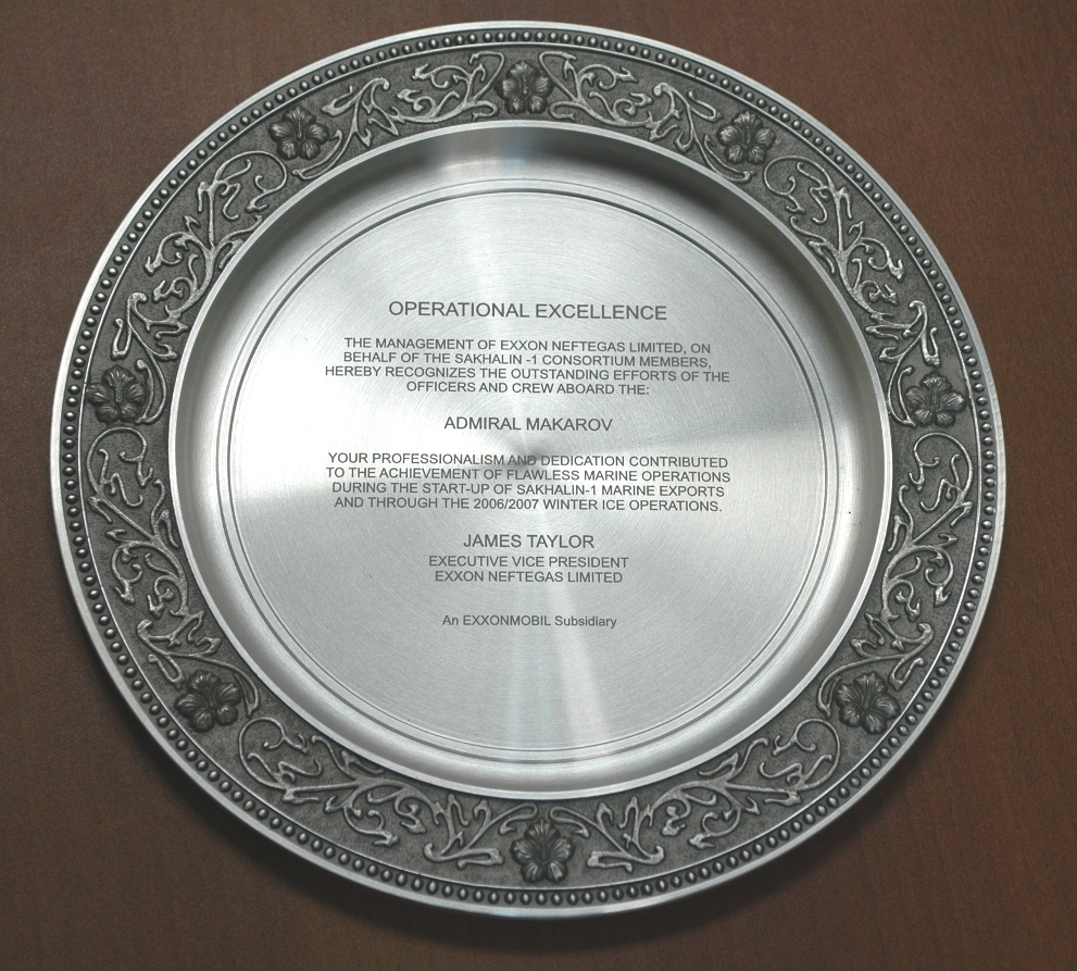 The presentation inscription, signed on behalf of James Tailor, Executive Vice-President, reads as follows: “EXXONMOBIL management, on behalf of the members of the “Sakhalin-1” Project Association, herewith pays homage to distinguished service of the crews of FESCO icebreakers the Krasin and the Admiral Makarov and expresses gratitude for high skilled qualification and commitment, leading to impeccable sea operation during the winter navigation 2006-2007”.